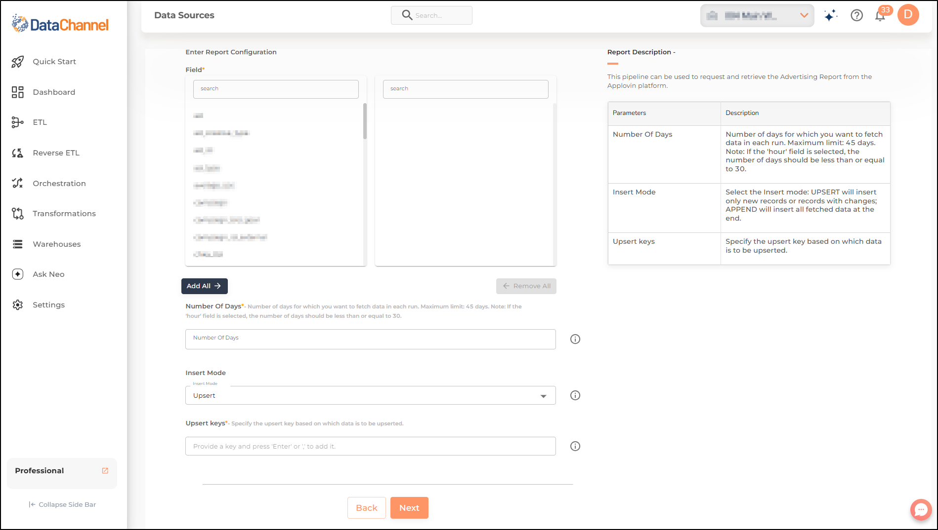 Required This refers to the manner in which data will get updated in the data warehouse, with 'Upsert' selected, the data will be upserted (only new records or records with changes) and with 'Append' selected, all data fetched will be inserted. |